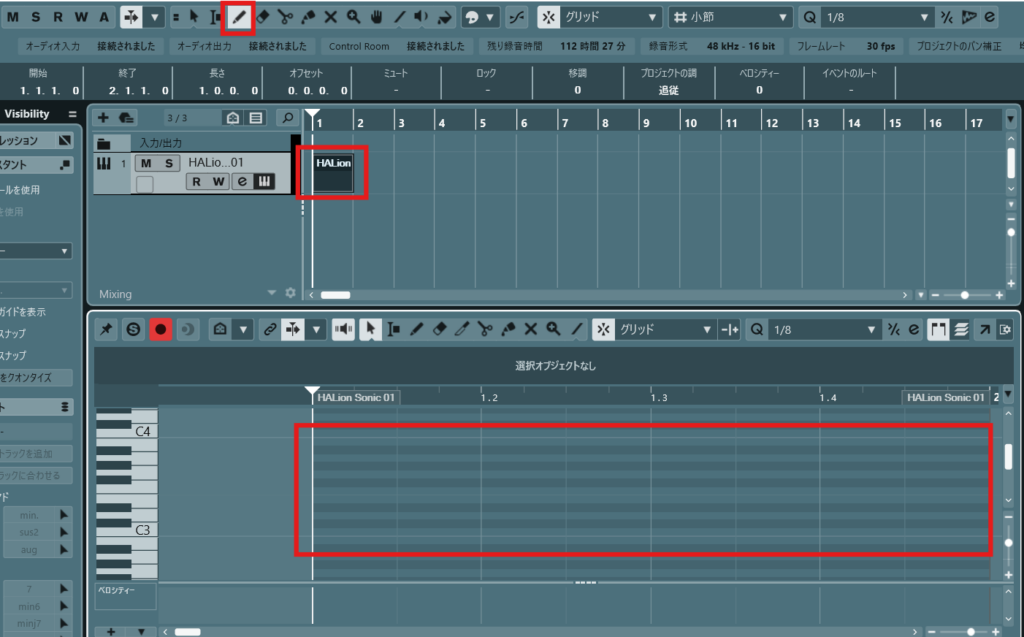 - キーボードを押す / ピアノロールにノートを書いて再生すると音が鳴る